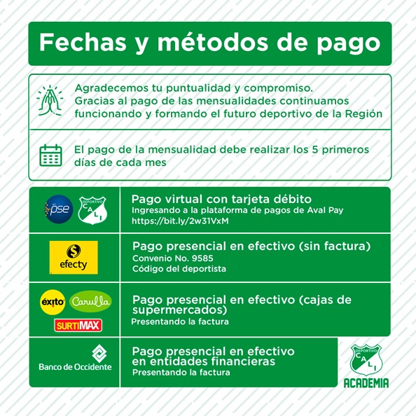Favor devolver el formato REACTIVACIÓN ACADEMIA, adjunto totalmente diligenciado sin enmendaduras, tachones o información no solicitada. Enviarlo por este medio academia@deportivocali.com.co 10 días antes del 01 del mes de regreso. Con el fin de incluirlo en listado y realizar la factura correspondiente al mes.